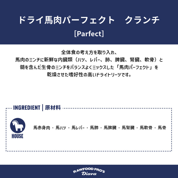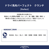 馬肉のミンチに、新鮮な内臓類と髄を含んだ生骨のミンチをバランスよく配合した「馬肉パーフェクト」を、そのまま乾燥させた嗜好性の高いドライトリーツです。